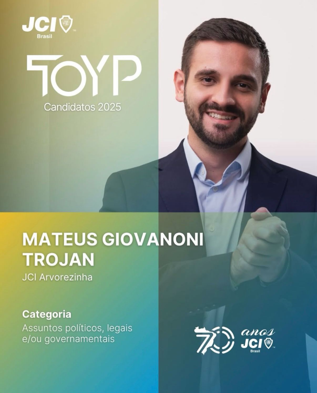 O prefeito de Muçum, Mateus Giovanoni Trojan, foi eleito um dos dez vencedores do prêmio TOYP 2025 (The Outstanding Young Persons), concedido pela JCI Brasil. Ele foi reconhecido na categoria “Assuntos Políticos, Legais e/ou Governamentais”, que destaca jovens de até 40 anos com atuação de impacto no setor público.