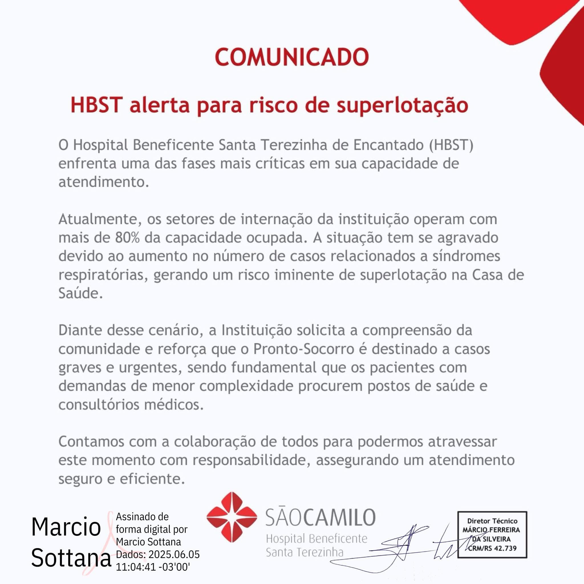 Em nota, o diretor-técnico do Hospital, Marcio Sottana, destaca que o crescimento no número de casos respiratórios tem levado à alta ocupação dos leitos disponíveis.