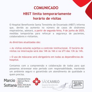O Hospital Beneficente Santa Terezinha (HBST), de Encantado, anunciou mudanças temporárias no horário de visitas, em razão do aumento de casos de síndromes respiratórias no município e região. As novas regras passam a valer a partir da próxima segunda-feira, 9 de junho de 2025.