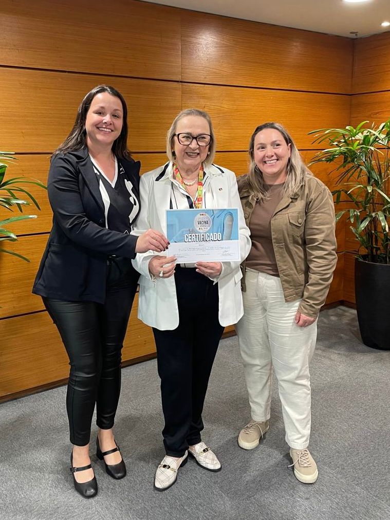 A entrega foi feita pela secretária estadual da Saúde, Arita Bergmann, durante cerimônia na capital. Representaram o município a secretária de Saúde de Muçum, Grasiela Devitte Fontana, e a profissional da Sala de Vacinas, Janaina Morás.